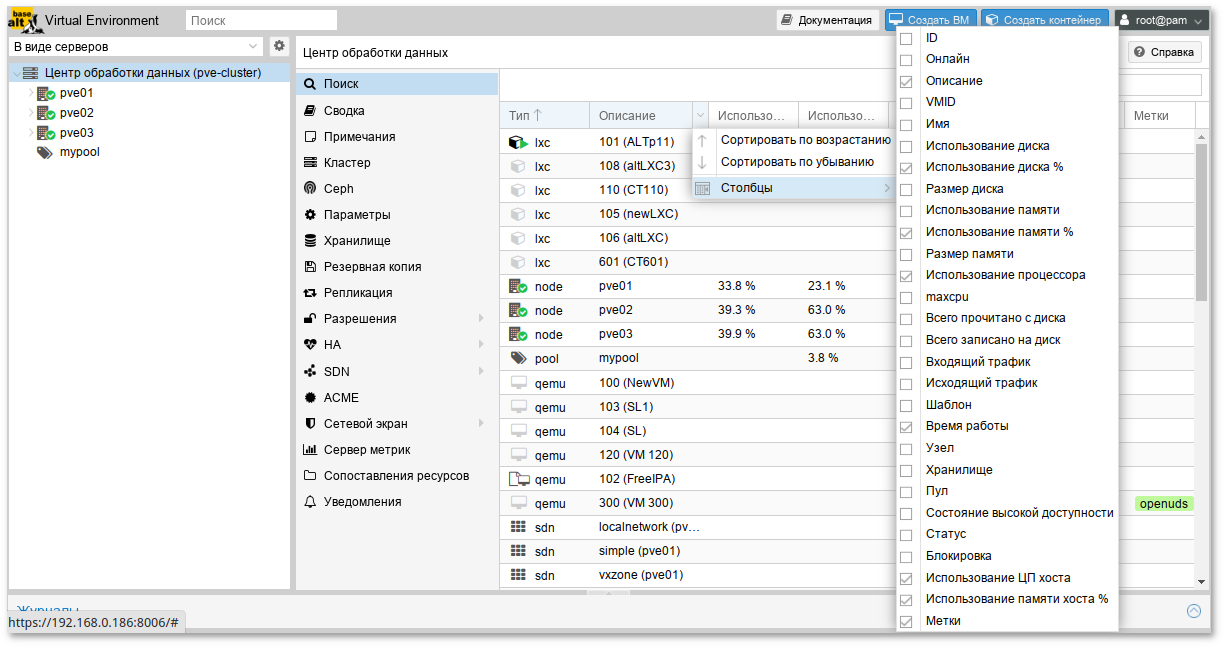 qmhttps://<имя-компьютера>:8006. Потребуется пройти аутентификацию (логин по умолчанию: root, пароль указывается в процессе установки ОС):